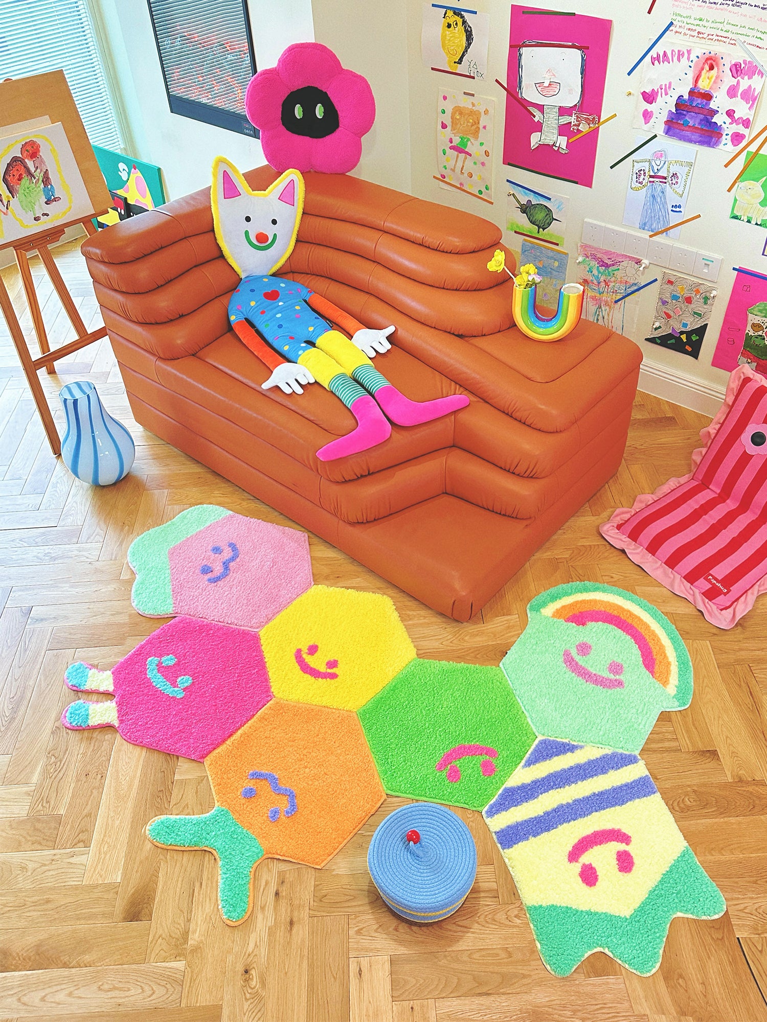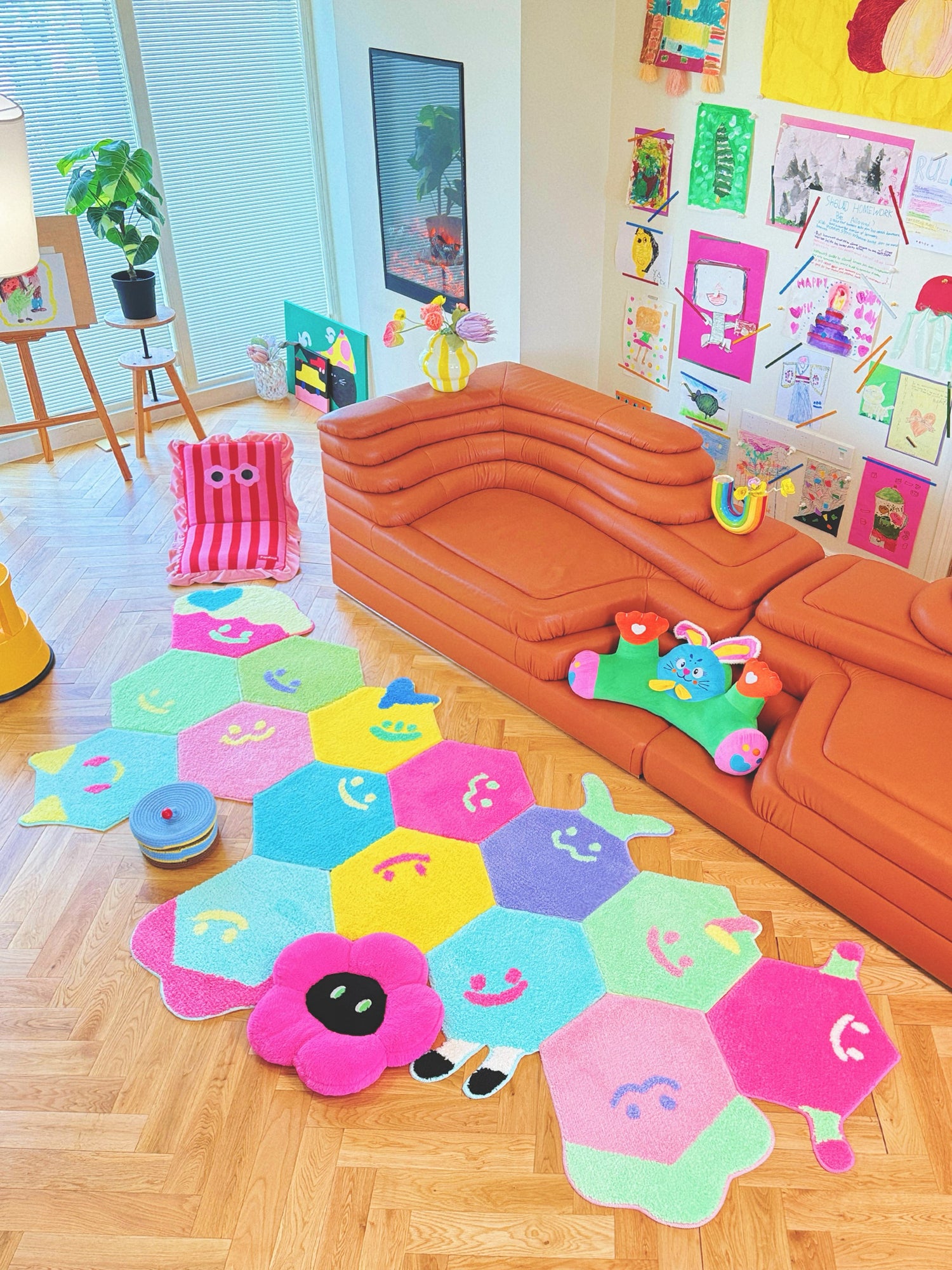 Basic Hexagon Rugs are perfectly regular hexagon tiles in solid colors, each with a playful smiley face pattern. Rotate them to spark fun little moments like eye contact between tiles.